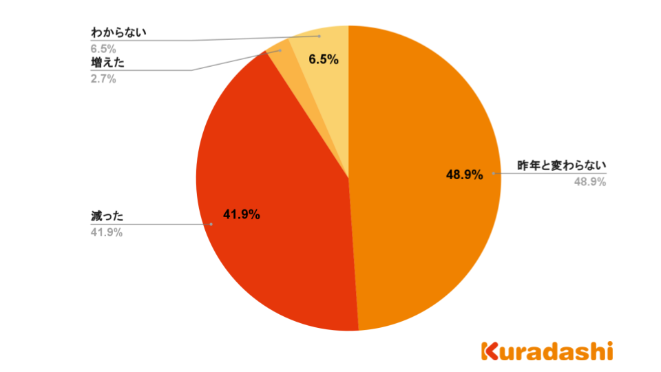 「昨年と変わらない」と回答した方が最も多く48.9%。次いで「昨年より減った」という回答が41.9%でした。家庭でのフードロスは、約半数が昨年と変わらないと感じる一方、約4割は減少しており、フードロス削減の意識や取り組みが一定の成果を上げていることが分かります。
