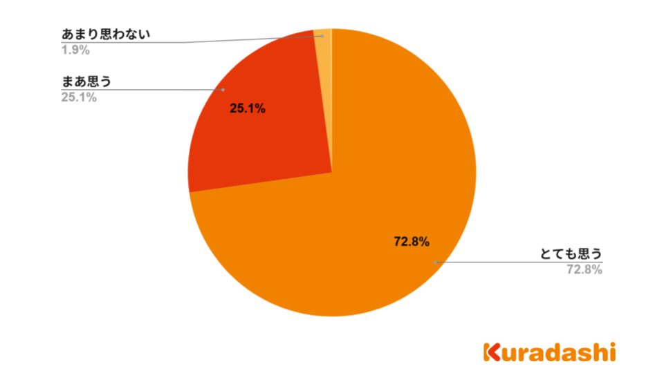 「とても思う」と回答された方が最も多く72.8%となり、「まあ思う」と回答された方は25.1%でした。2024年の意識調査(※2)では、「とても思う」と回答された方が70.8%で、今年は昨年より+2%増となり、昨今の継続する物価高騰が家計に大きな影響を与えていることが分かります。