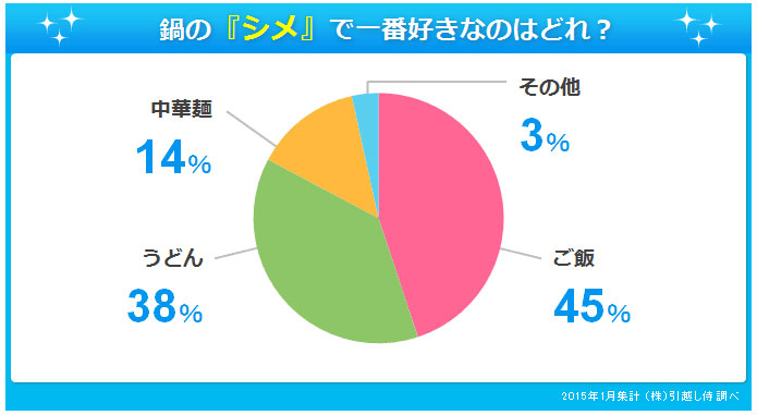 また、『うどん』も38%と、ご飯に続く高い人気を見せており、鍋の最後のシメは『ご飯派』と『うどん派』で二分する形となっています。