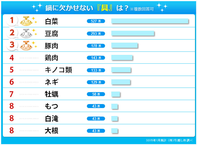 白菜・豆腐を筆頭に、鍋の定番といえるような具が、TOP10のほとんどを占める結果となりました。