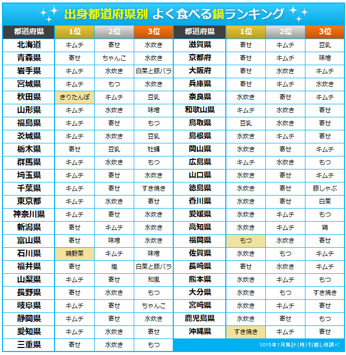 地域別の傾向を見てみると、北海道や東北、関東、中部は『キムチ鍋』、北陸や関西は『寄せ鍋』、中国・四国から九州にかけては『水炊き』が、多くの県で1位を獲得しています。