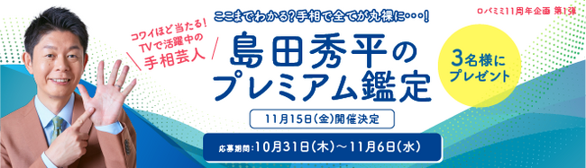 『ロバミミ』に初登場となる手相芸人・島田秀平さんのプレミアム鑑定を抽選で3名様にプレゼントいたします。芸能界でも話題の鑑定がZoomで直接体験できる貴重な機会にぜひお申し込みください。※鑑定料金はいただきません。