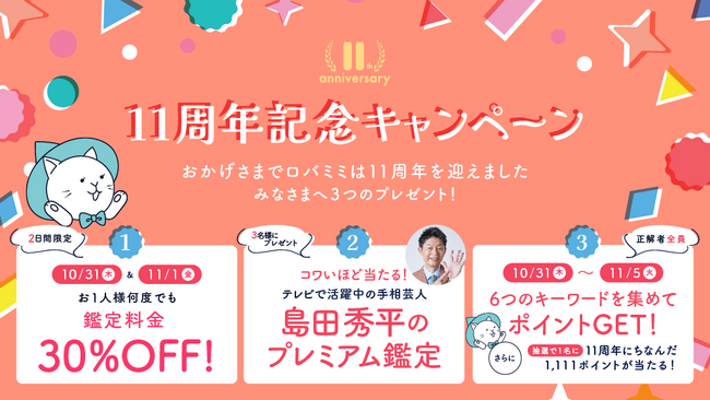 サービス開始より多くのお客様に支えられ、おかげさまで『ロバミミ』は2024年10月31日(木)に11周年を迎えました。日頃の感謝の気持ちを込めて「11周年記念キャンペーン」と題して3大キャンペーンを開催いたします。