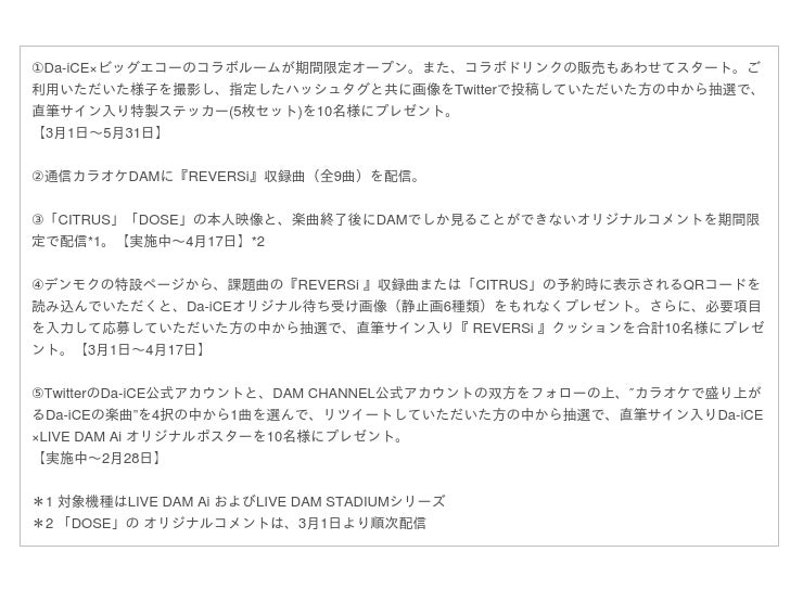 また、3月1日よりビッグエコー10店舗で、『REVERSi』の収録曲とコラボしたドリンクを販売するほか、渋谷センター街本店、梅田茶屋町本店の2店舗では、Da-iCEのコラボルームを期間限定でオープンします。