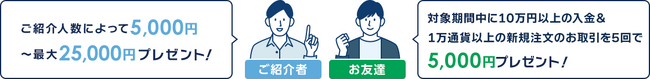 すでに『外貨ネクストネオ』を開設しているお客様(「ご紹介者様」)が、『外貨ネクストネオ』に興味をお持ちの方(「お友達」)を紹介していただき、後日その「お友達」が条件(『外貨ネクストネオ』にて10万円以上の入金(※1)、および1万通貨以上の新規取引を5回以上)を満たされた場合には、「ご紹介者様」と「お友達」の双方にもれなく現金5,000円をプレゼントいたします。