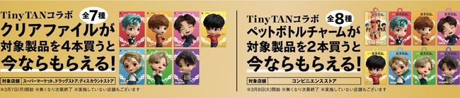 3月7日(月)から、「紅茶花伝」いずれかの製品(※エリア限定品を含む)をスーパーマーケット、ドラッグストアなどで4本お買い上げいただくとA4クリアファイルがもらえます。また、コンビニエンスストアでは、3月8日(火)から「紅茶花伝」2本をお買い上げいただくと「紅茶花伝」と「TinyTAN」の限定コラボアイテムとしてペットボトルチャームがもらえます。