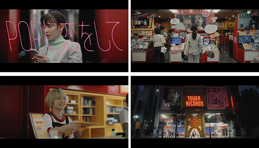 アイドルを好きな人ならば通ったことのある場所、それはタワーレコード。店員さんが心を込めて描いたPOPを見て、「この気持ち、わかる」「こんな感じ方もあるんだ!」と感銘を受けたことがある人も多いはず。タワーレコードの店員さんたちの「アイドルへの想い」への共感とリスペクトをもとに、オリジナル楽曲「POPに恋をして」を制作しました。楽曲の歌詞は、「あなたにとってアイドルとは?」という質問を日本全国80人の店員さんに投げかけ、集まった回答から制作。作曲は人気音楽プロデューサーの岡嶋かな多さん、歌は岡山発のロックバンドUNFAIR RULEでボーカルを務める山本珠羽さんに担当いただき、アイドルを好きな人だけでなく、アイドルとして働く全ての人にとっても活力となるような楽曲づくりを目指しました。また、ミュージックビデオでは、アイドルとゆかりの深い場所でもあるタワーレコード渋谷店を舞台に、主人公の女性が、忙しい日々の中、アイドル「ユウミ」に出会い、またそのアイドルの棚を訪れるファンたちと巡り合うことで、何気ない日々がちょっとだけ晴れやかになっていく姿を描いています。