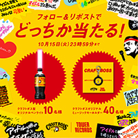 「クラフトボス」とタワーレコードのコラボレーションを記念して、9月30日(月)10時にポストされるキャンペーン投稿をリポストすると、抽選で50名様にオリジナルのアイドル応援グッズが当たるキャンペーンを実施します。