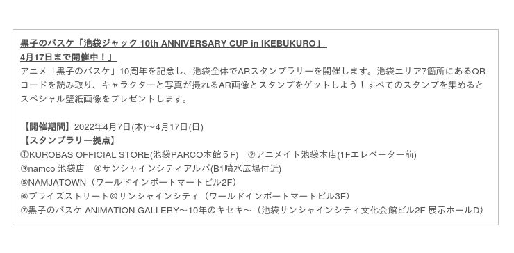 また、同日の4月7日(木)から4月17日(日)まで池袋にて「池袋ジャック 10th ANNIVERSARY CUP in IKEBUKURO」のスタンプラリーを開催。各所で「黒子のバスケ」に関するイベントが行われ、街全体で「黒子のバスケ」アニメ化10周年をお祝いします。