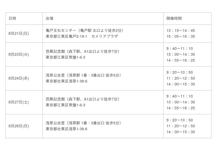 ポイント3. 東京 浅草・亀戸・森下で8/21〜28の夏休み期間中に計14回も開催!