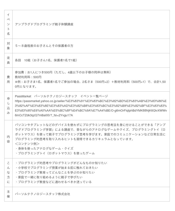総合人材サービスのパーソルグループでIT・ものづくりエンジニアの人材派遣を手掛けるパーソルテクノロジースタッフ株式会社(本社:東京都新宿区、代表取締役社長:正木 慎二、以下パーソルテクノロジースタッフ)は、8月に東京都内にて親子向けのパソコンを使用しないプログラミング講座を開催いたします。