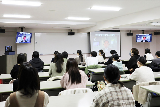 海外研修支援企業「ライトハウス・キャリアエンカレッジUSA」の協力のもと、Big4と呼ばれる大手会計事務所の一つであるアーンスト・アンド・ヤングLLPロサンゼルス事務所から講師をお招きしたことで、来春に会計事務所へ就職する学生をはじめ、簿記を学びこれから就職活動をはじめる1年生にとっても知見を深める機会となりました。