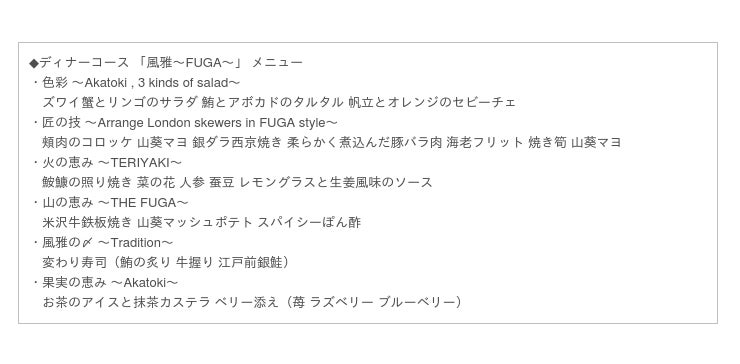 当ホテル25階の和風ダイニング&バー FUGA(風雅)では、「TOKii」で提供されているア・ラ・カルトメニューを組み合わせ、さらには日本の食材・調味料でアレンジされたコースとして提供します。まさに「逆輸入」を超えた「Uターン」メニューとなっております。