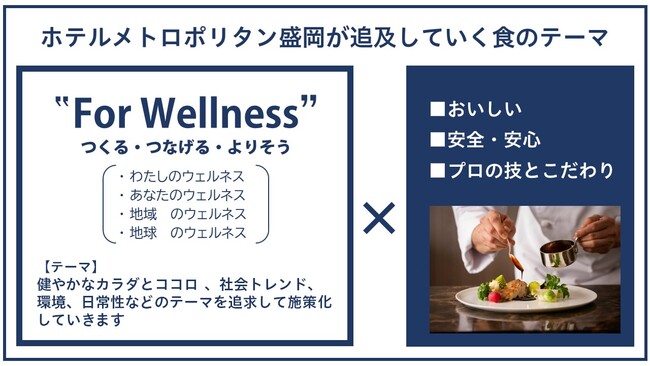 ホテルメトロポリタン 盛岡 (本館:所在地/盛岡市盛岡駅前通、NEW WING:所在地/盛岡市盛岡駅前北通 総支配人/佐藤隆)は、ホテルでの様々なシーンで特別なひと時をお過ごしいただけるよう、和・洋・中それぞれのシェフによる妥協を許さないこだわりの料理を提供しております。そこで培った技術をさらに広げて「おいしい」「安全・安心」「プロの技とこだわり」をベースに、カラダとココロを健やかに整え、遊び心や多様性を兼ね備えた企画を展開し、食のテーマを通じてより健康的に美しく、人生を豊かに彩るライフスタイルを提案する「For Wellness」プロジェクトを始動します。
