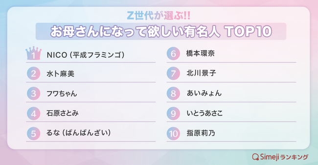 【Simejiランキング】Z世代が選ぶ!!「お母さんになって欲しい有名人TOP10」