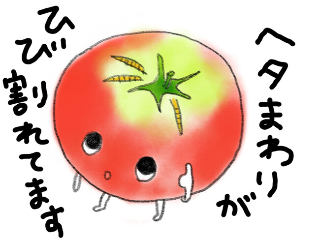 ◯トマト:ヘタまわりが緑色でヒビ割れている