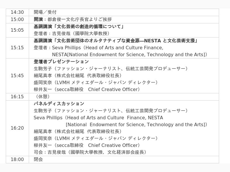 本シンポジウムでは、文化経済部会の議論をけん引した座長の吉見俊哉氏(國學院大學教授)をはじめ、英国で文化芸術への投資プロジェクトを率いるSeva Phillips氏(Head of Arts and Culture Finance, NESTA)、文化経済部会委員で伝統工芸を活用したデザインを手掛ける生駒芳子氏(ファッション・ジャーナリスト、伝統工芸開発プロデューサー)、伝統技法を強みに世界にビジネスを展開する細尾真孝氏(株式会社細尾 代表取締役社長)、伝統と革新を両輪としたサステナブルな事業を推進する盛岡笑奈氏(LVMH メティエダール・ジャパン ディレクター)、伝統技術とテクノロジーとの掛け合わせにより新たな価値を提案する柳井友一氏(secca 取締役 Chief Creative Officer)の 6 名をお招きし、世界的に日本の文化芸術への注目が高まる中で、この流れを持続的に日本の文化芸術の発展・継承に繋げるために、文化芸術の作り手と価値づけのメカニズムを理解している企業の協業の可能性について、実例を上げながら掘り下げます。