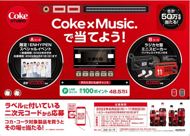 一昨年、昨年とガマンの夏を2度乗り越え、今年こそ“本物の夏”を楽しみたいと多くの人が期待に胸を膨らませています。「コカ・コーラ」サマーキャンペーンでは、イギリスの伝説的なバンドQueenの代表曲のひとつである「A KIND OF MAGIC/カインド・オブ・マジック」を世界中のアーティストが「コカ・コーラ」のボトルの中で奏で、音楽の歓びを「コカ・コーラ」のおいしさに重ねて表現した新TVCM「Conductor」篇(30秒、60秒)を放映します。さらに、K-POPライジングスターENHYPENなど各国の新進気鋭のアーティストたちによる「A KIND OF MAGIC/カインド・オブ・マジック」のカバーが聞ける音楽コンテンツ「Coke Studio」をローンチするほか、期間中に「コカ・コーラ サマーキャンペーン」対象製品を購入するとENHYPENの限定スペシャルイベントや、ラジカセ型ミニスピーカー(ワイヤレスイヤホン付き)、LINEポイントなどがその場で当たるインスタントウィンキャンペーンも実施します。