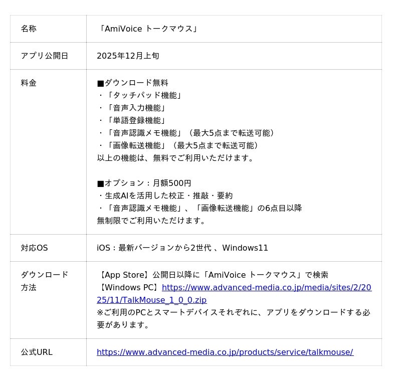 株式会社アドバンスト・メディア(本社:東京都豊島区、代表取締役会長兼社長:鈴木清幸 以下、アドバンスト・メディア)は、マウス機能にAI音声認識AmiVoiceと生成AIを連携した新アプリ「AmiVoice トークマウス」を、2025年12月上旬よりApp Storeにて無料で(一部機能は有料オプションとして提供)リリースします。