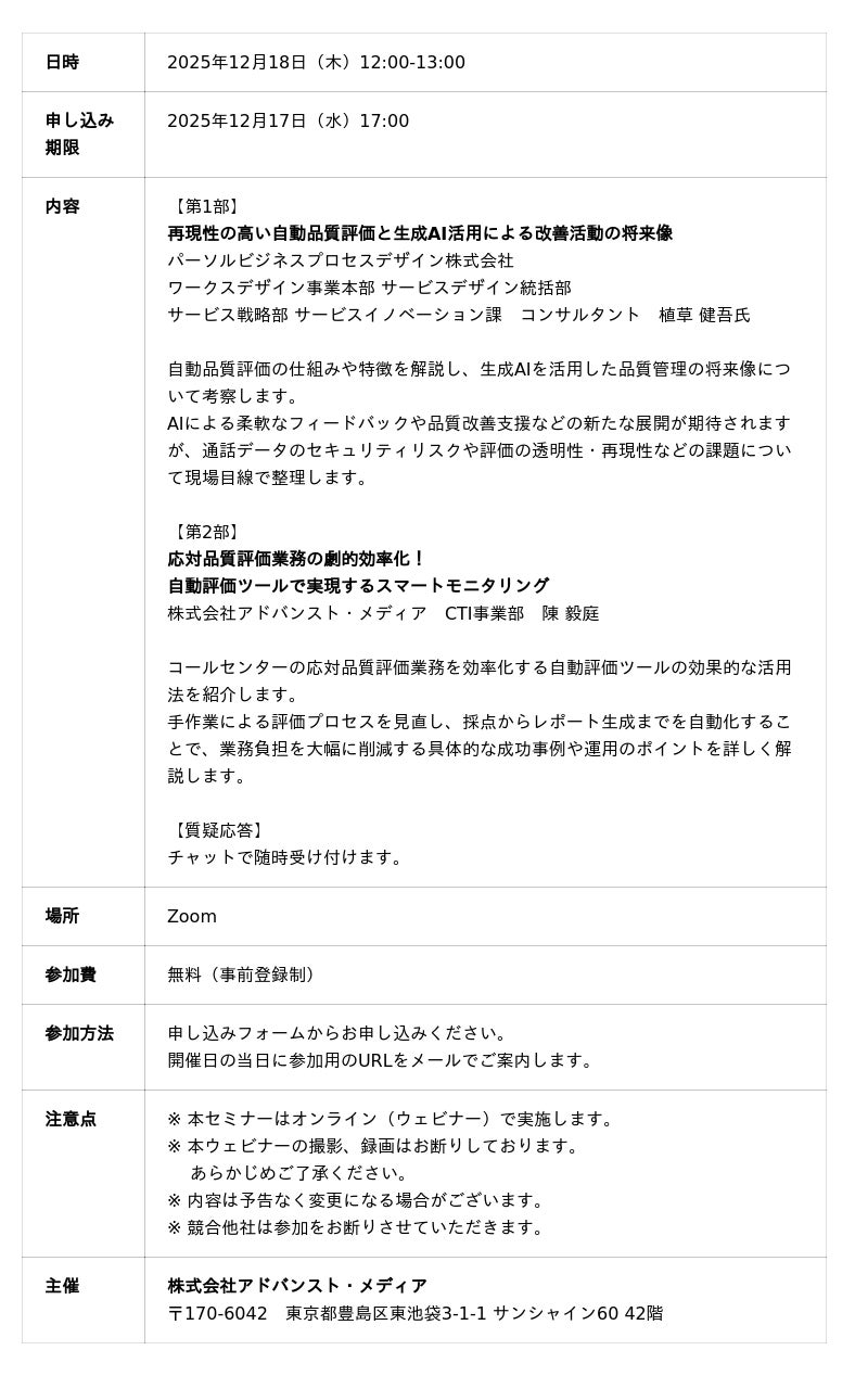 2025年12月18日(木)、株式会社アドバンスト・メディア(本社:東京都豊島区、代表取締役会長兼社長:鈴木清幸 以下、アドバンスト・メディア)は、オンラインセミナー「モニタリング効率を高める自動品質評価の“考え方と使い方”〜自動品質評価×AI活用で押さえるべきポイント〜」を共催いたします。