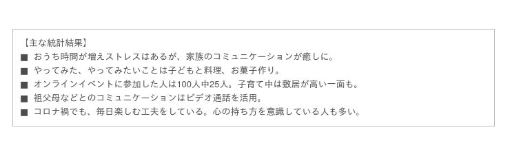 新型コロナウイルス感染症が2020年1月に国内で確認されてから2年近くが経過しました。ステイホームが提唱され、「おうち時間」という言葉も定着しました。今回のレポートでは、おうち時間を親子でどのように過ごしているのか、困っていることや工夫していること、また、オンラインイベントへの参加の有無、ママたちのコミュニケーションの変化などについて電話で聞き取り調査をおこないました。