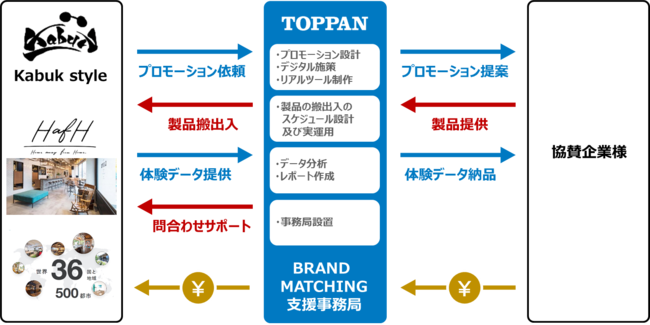 「HafH」の宿泊施設に対し、凸版印刷と提携している製品におけるプロモーションの場を設置。宿泊施設のメディア化をはかるとともに、各施設と親和性の高いメーカー商品を設置することで、ユーザーに製品の価値体験を提供します。