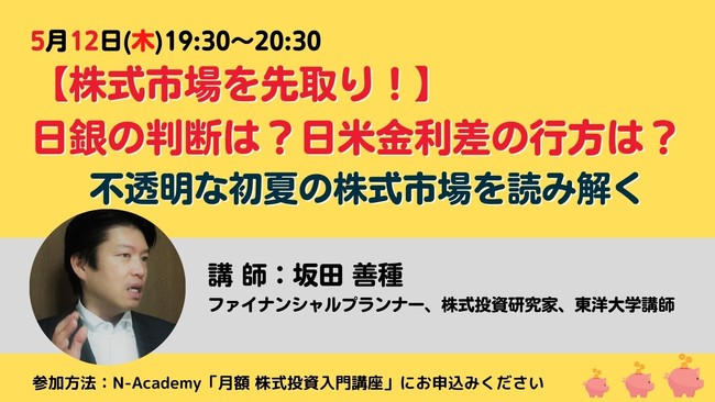 株式会社デジタル・ナレッジが運営する、会員数23万人超を誇るネットスクール「N-Academy(エヌ・アカデミー)」は、株式投資をやってみたい方、投資初心者の方に人気の「月額 初歩からわかる株式投資入門講座」にて、旬の情報をお届けするオンライン配信セミナー『【株式市場を先取り!】日銀の判断は?日米金利差の行方は?不透明な初夏の株式市場を読み解く』を2022年5月12日(木)19:30から開催いたします。本セミナーは「月額 初歩からわかる株式投資入門講座」にお申込みいただいた皆様に公開いたします。
