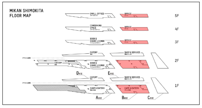 「ミカン下北」B街区は、商業店舗1区画と全7室からなるオフィス区画、駐輪場で構成された地上5階建ての施設となります。
