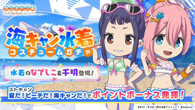 また、イベントに先駆け6月30日(金)より、なでしこと千明のゲームオリジナル水着が手に入る【海キャン水着コスチュームガチャ】、ゲームオリジナル海キャンカードが獲得可能な【夏だ!ビーチだ!海キャンだ!サポートカードガチャ】を開始いたしました。