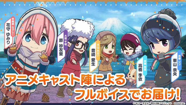 各務原なでしこ、志摩リン、大垣千明、犬山あおい、斉藤恵那など、おなじみのキャラクターのモーション&フルボイスの豊富な掛け合いや、1,000を超えるキャンプギアや乗り物、美味しそうなキャンプ飯、山梨・長野・静岡を中心とする各地の美しい景色など、TVアニメ『ゆるキャン△』の要素が続々登場予定です!