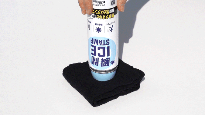 使い方は簡単3ステップです。まずタオルやハンカチ等を水で濡らします。次に本体を逆さまにし、スタンプを直接当て1秒〜3秒間プッシュします。最後に冷やしたい箇所に当ててアイシングやクールダウンしてください。折りたたんでスタンプすると複数個所を凍結できます。