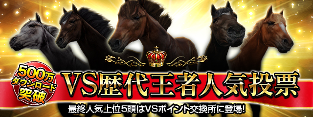 VS歴代週度代表馬の人気投票を行い、投票者には「500万DL突破記念チケット」をプレゼント。期間中、毎日1回投票できます。