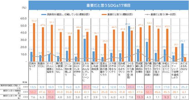 生活者が重要だと思う項目を、回答してもらいました。複数回答の上位には、“貧困をなくそう”“すべての人に健康と福祉を”といった個人の生活に影響することが分かりやすい項目が上位に登場します。次に、昨今メディアでも取り上げられることが増えている“海の豊かさを守ろう”海に関する項目が続きます。海に関する項目も、漁獲量の減少で海産物価格の高騰、魚が海洋中のマイクロプラスティックを食べる事による生態系への影響を考えると、個人としての危機感もありそうです。