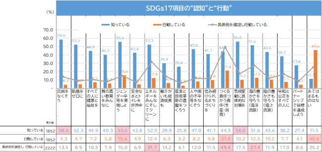 次に、SDGsという言葉から、「持続可能な開発目標の17ゴール」へ視点を移していきたいと思います。「持続可能な開発目標の17ゴール」から「知っている」「行動している」項目について回答を得ています。ここでは、「無意識なSDGs行動」をあぶりだしています。まず、「持続可能な開発目標の17ゴール」の項目だけを見て回答してもらい、その後「持続可能な開発目標の17ゴール」の具体的事例※を提示し、ご自身が普段の生活の中で行動している項目を再度回答してもらいました。