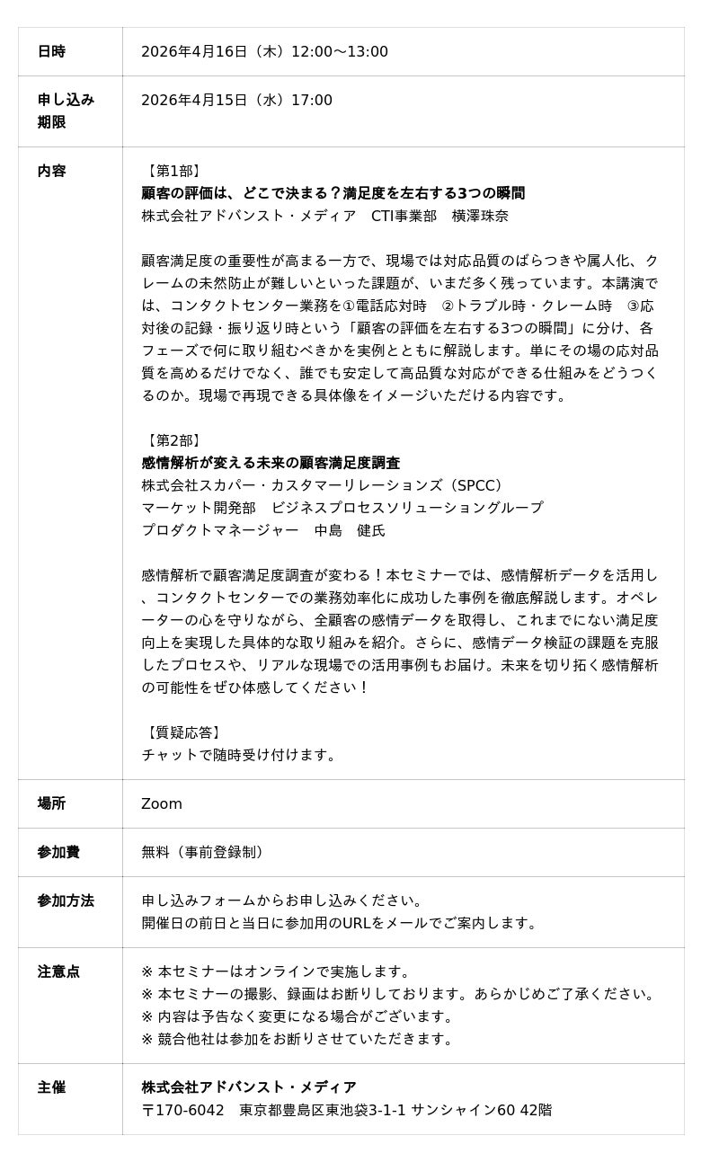 2026年4月16日(木)、株式会社アドバンスト・メディア(本社:東京都豊島区、代表取締役会長兼社長:鈴木清幸 以下、アドバンスト・メディア)は、アドバンストメディア×スカパー・カスタマーリレーションズ(SPCC)オンラインセミナー「音声×感情解析で顧客満足度を上げる データから読み解くお客様の隠れた本音とは?」を共催いたします。