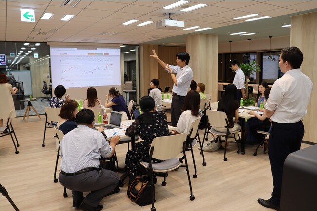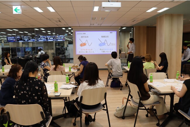 当日は、恵比寿ガーデンプレイスタワー28階の当社「金融を、もっと面白くする」エリアに初めて約20名の女性投資家及び潜在的女性投資家をお招きし、当社現役為替ディーラー井口が、外国為替証拠金取引(FX)の使い方やメリットに加えて、スワップポイントなどFXトレードに必要な基本ワードを解説後、当社デモトレードを使った演習も一緒に実施しました。