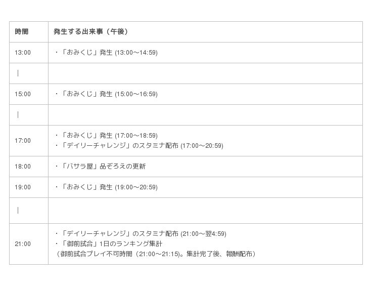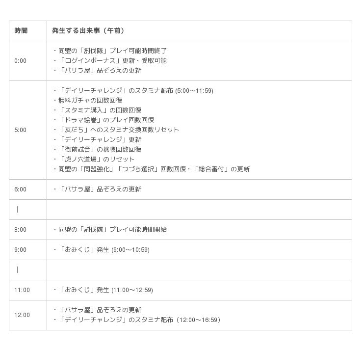 『戦国BASARA バトルパーティー』では、1日の間にさまざまなシステムの切り替わりが発生する。そのタイミングを把握することで効率良くプレイできるので、以下のタイムテーブルを参考に備えてほしい。