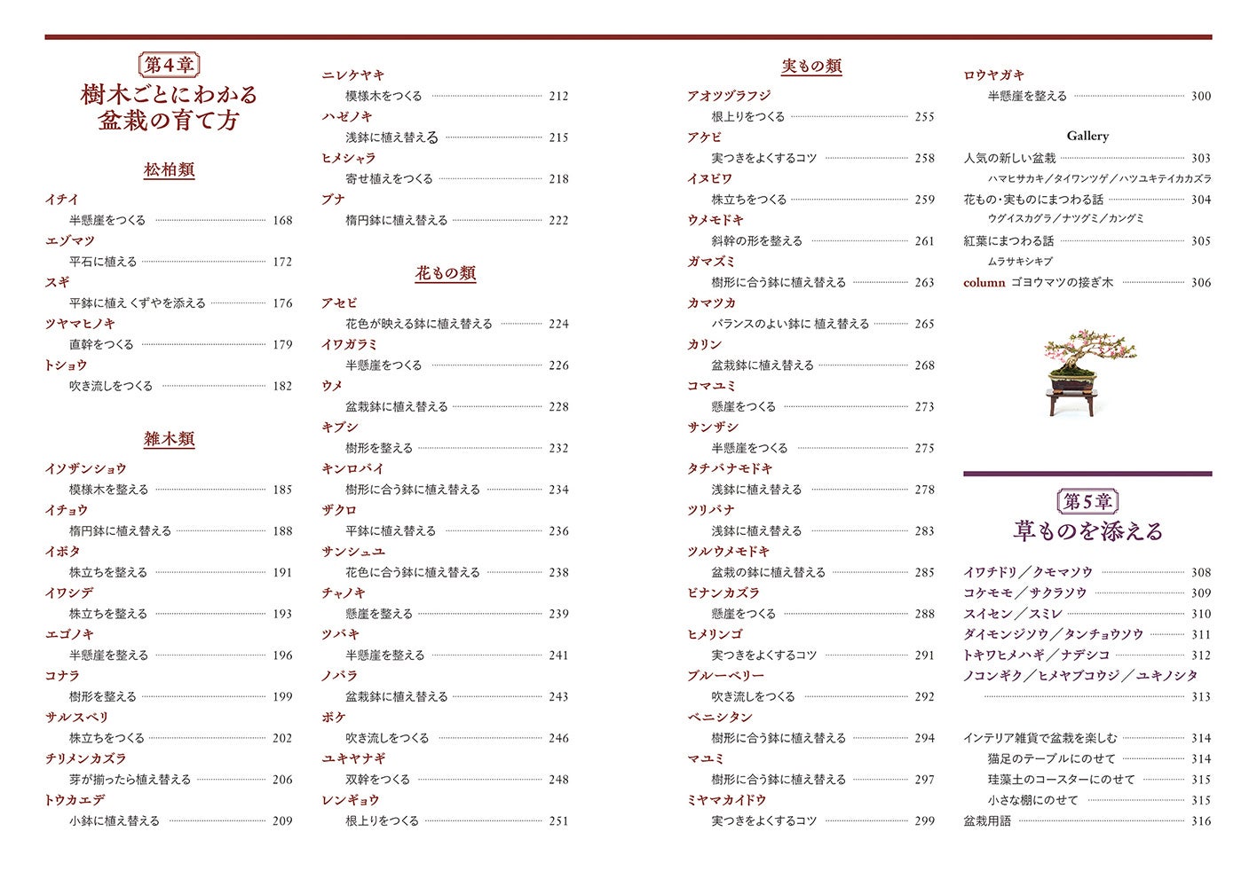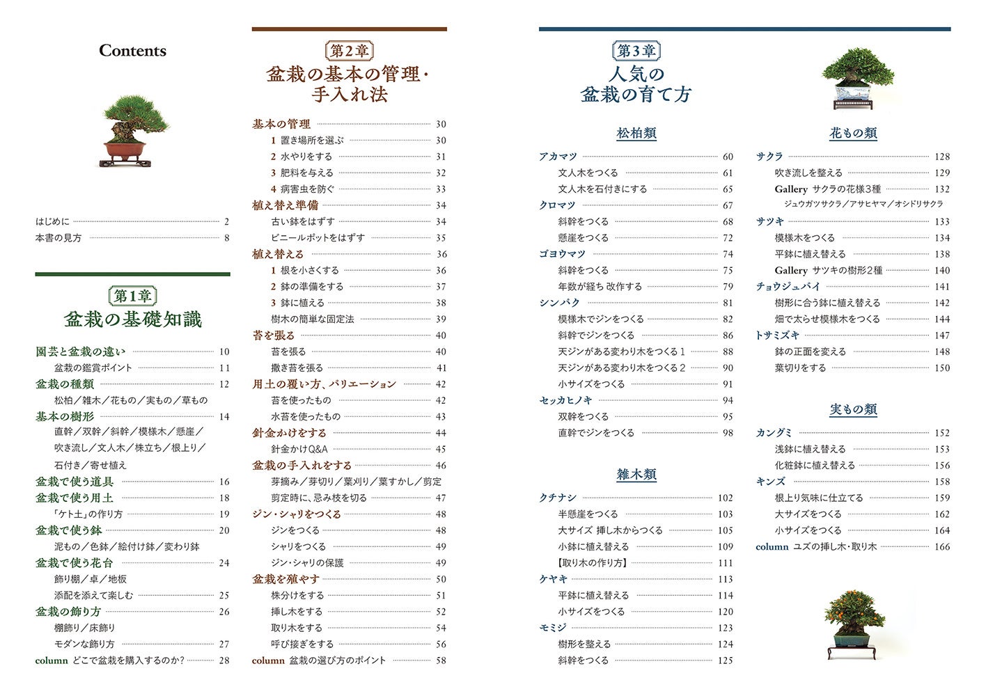 第3章・第4章では、盆栽のつくり方を樹種ごとに具体的に解説します。