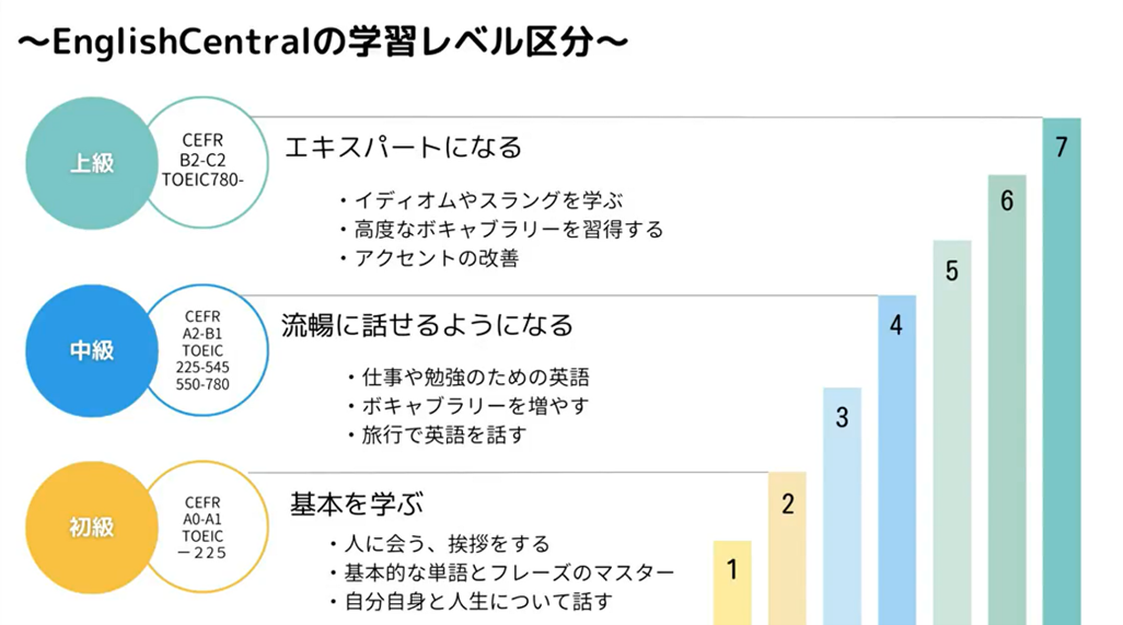 ユーザーは7段階の学習レベルから選択し、レベル別の動画と学習プログラムで着実にステップアップできます。