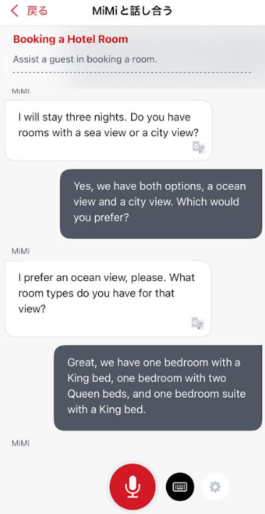 OpenAI社のChatGPT技術を搭載したAIチャットボット「MiMi」との自由な英会話練習が可能です。