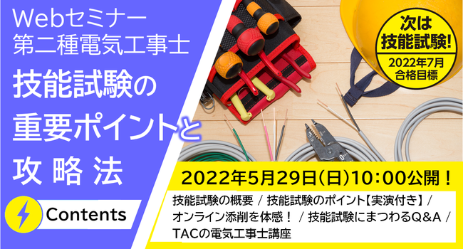 電気工事士試験対策講座を展開しているTAC株式会社(東京都千代田区、代表取締役:多田敏男)は5/29(日)に実施される『令和4年度上期 第二種電気工事士試験』の難易度分析や講評、解法などを解説する試験講評を、6/2(木)にTACのWebサイトで公開いたします。さらに!7月技能試験攻略のポイントを実演を交えてお伝えするWebセミナーを5/29(日)10時に公開いたします。