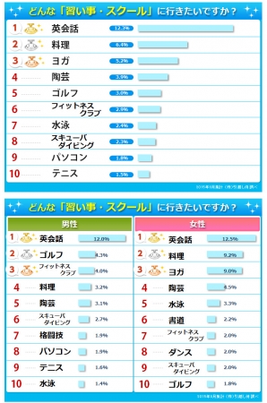 「これからやってみたい習い事」のランキングのTOP3は、1位が英会話(12.3%)、2位が料理(6.4%)、3位がヨガ(5.2%)と、やっているものと似た傾向のランキングとなっており、人気の高さが伺えます。中でも英会話は、2位の料理に2倍程度の差をつけダントツの1位となっています。