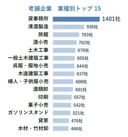 老舗企業を業種別(細分類)でみると、「貸事務所」が1401社で最多となった。15年前から、およそ1000社近く増加している。次いで、規制の影響で新規参入が難しく約8割を老舗企業が占めている「清酒製造」が936社で続いた。また、日本特有の温泉旅館が多く含まれている「旅館」は783社だった。