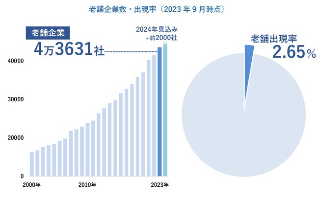 創業・設立から100年を上回る老舗企業の数は、2023年9月時点で4万3631社となった。毎年約2000社前後が老舗企業の仲間入りを果たしており、今後も同様の傾向で推移するものと見込まれる。数々の戦禍や災害などから老舗の「のれん」を守り抜くことは決して容易ではなく、事業継続の要諦が凝縮されている教科書的存在として取り上げられる事例も多々見られる。老舗企業の約半数は売上高1億円未満の小規模事業者であるなかで、たとえ小さくとも息を絶やすことなく長い業歴に達したケースも多い。