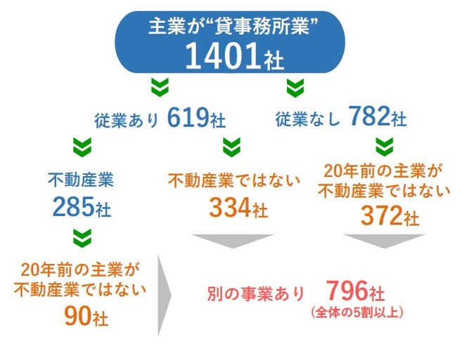 実際に主業が「貸事務所」の1401社のうち従業がある619社について、従業が不動産業ではない業種は334社、不動産業は285社に分かれた。さらに、従業も不動産業である285社のうち90社が、20年前の主業は不動産業とは異なる業種だった。従業がない企業782社については、20年前の主業が不動産業とは異なる業種の企業は372社となった。