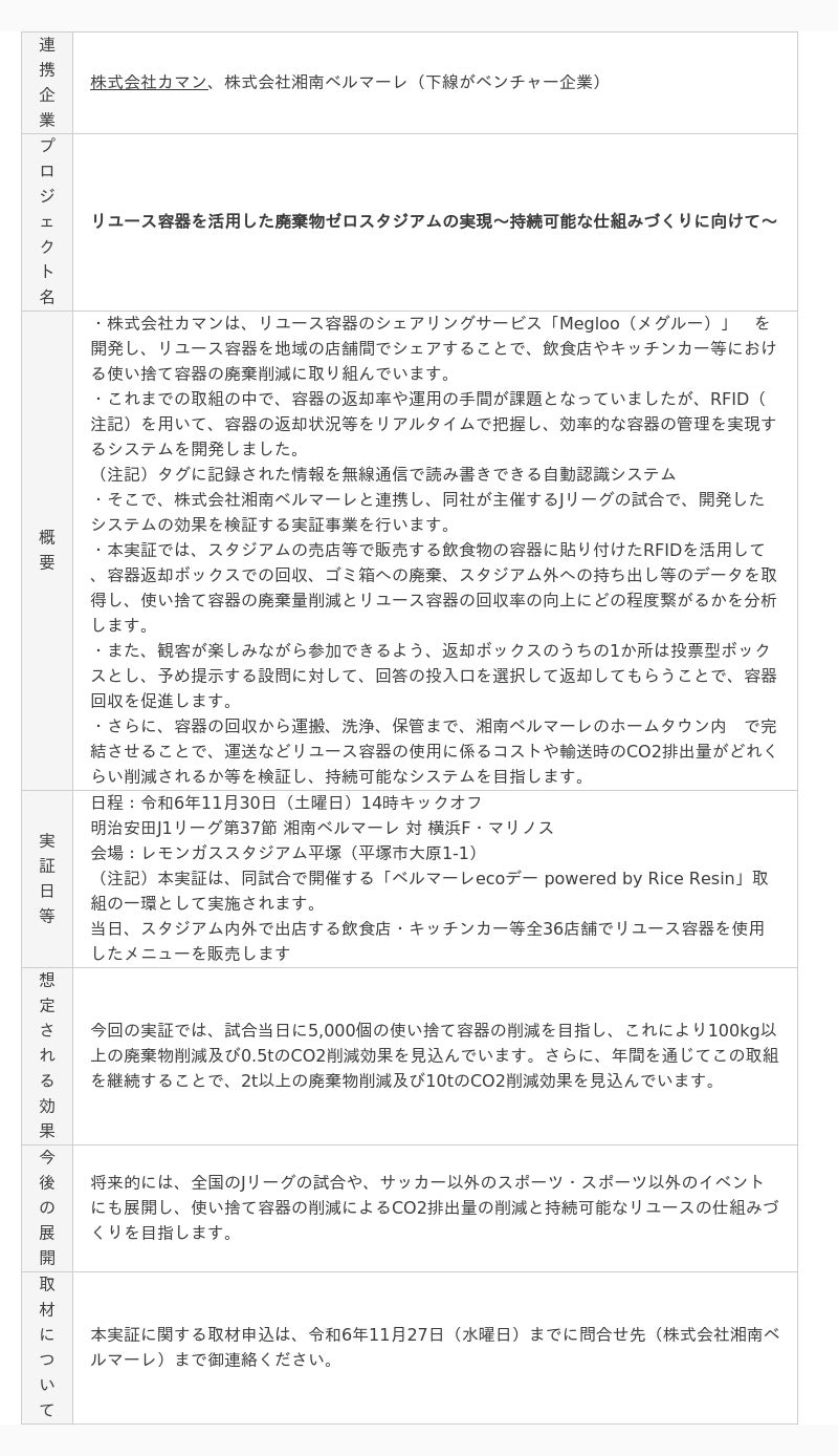 県では、ベンチャー企業の成長を加速させるため「ビジネスアクセラレーターかながわ(BAK)」の取組により、大企業等とベンチャー企業によるオープンイノベーションを促進するとともに、事業化の支援を行っています。このたび、令和6年度の支援プロジェクトに採択された株式会社カマンと株式会社湘南ベルマーレが、連携して実証事業を開始しますので、お知らせします。