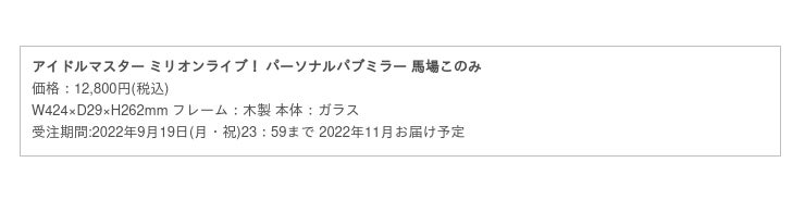 株式会社バンダイナムコアミューズメントは、『アイドルマスター ミリオンライブ! パーソナルパブミラー 馬場このみ』を8月30日(火)に発売します。「馬場このみ」は、「アイドルマスター ミリオンライブ!」に登場するアイドルの一人。6月12日生まれ、身長143cm、趣味は北米ドラマ鑑賞。好きなものは日本酒という山口県出身の24歳です。同日より株式会社バンダイナムコエンターテインメントが運営するECサイト、「アソビストア」にて期間限定の受注販売を開始します。