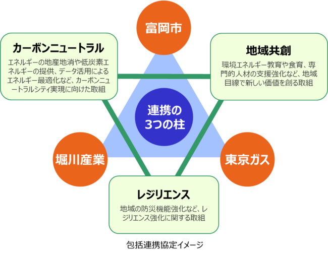 富岡市(市長:榎本 義法)、堀川産業株式会社(社長:堀川 雅治、以下「堀川産業」)、東京ガス株式会社(社長:内田 高史、以下「東京ガス」)は、本日、「カーボンニュートラルシティ実現に向けた包括連携協定」(以下、「本協定」)を締結しました。