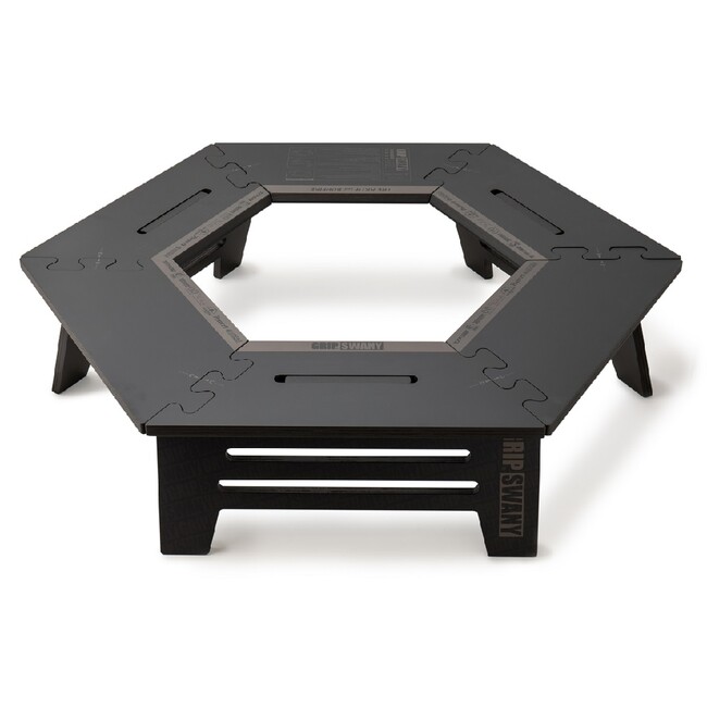 多彩なアレンジが魅力のヘキサテーブル“グリ次郎”を、グリップスワニーがマットブラックにアレンジ。本ジャック企画で登場した8つのガレージブランドのロゴが施されたスペシャル天板。