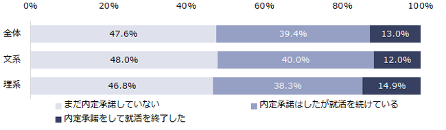 現在の内定数を伺うと、文系は34.1%(1〜3社:32.5%、4社以上:1.6%)、理系は43.9%(1〜3社:40.6%、4社以上:3.3% )が内定を得ていることが分かりました。すでに内定を得ている方に承諾状況を伺うと、39.4%が「内定承諾はしたが就活を続けている」と回答しました。